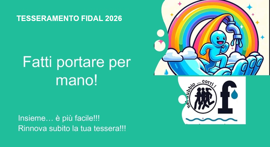 Novità ASSOLUTA!!! Ottima agevolazione per i nostri tesserati: per l'annualità 2026 il tesseramento Fidal per i soci Fontanina ha un costo di € 20,00 annue (nonostante il costo ufficiale della tessera FIDAL sia di € 25,00).